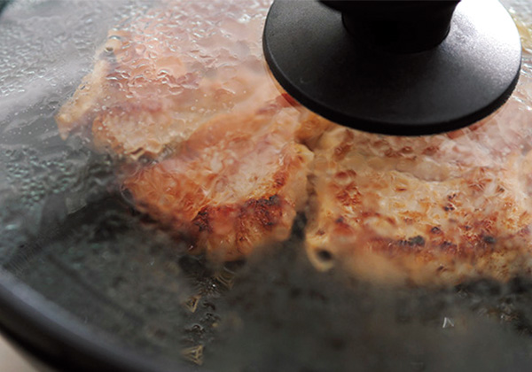 肉をキッチンペーパーで巻き、漬け床とともに保存袋に入れ、冷蔵庫でひと晩おく。 - (1)の肉を常温に戻す。フライパンに油をひき、弱火で片面に焦げ目がしっかりとつくまで焼き、ひっくり返して火を止める。あしらい野菜を入れ、蓋をしたら余熱で仕上げる。