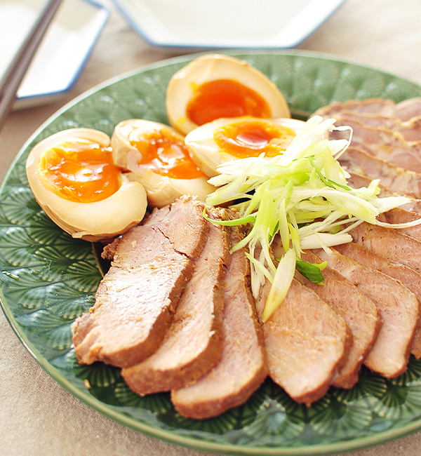 - 残った煮汁にゆで卵も入れ、粗熱が取れたら冷蔵庫に入れて一晩冷やし、肉を薄く切り分けて盛り付ける。