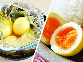 ポリ袋に酢と水をそれぞれ大さじ2ずつ、塩小さじ半入れて混ぜ、ゆで卵を入れて30分ほどおく(写真のゆで卵はカレー粉を少し加えて色を付けていますが無くても出来ます)。
