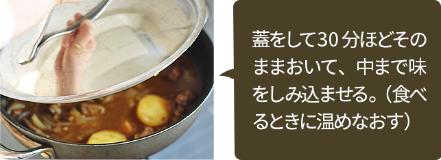 - カレールゥを入れる前に、あらかじめ材料にじっくり火を通しておけば、カレールゥを入れてからは長時間煮る必要はなく、ここからは冷ますことで中まで味をしみ込ませていきます。煮物は冷ますときに味が染み込んでいきます。食べるときにもう一度火にかけて温めなおしてください。
