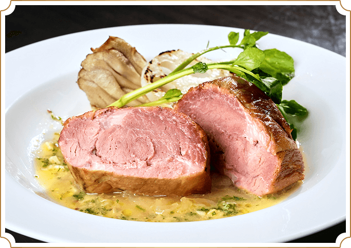 豚肉料理を得意とする町筋シェフの手腕が光るひと皿が、アメリカンポークを使った「シャルキュトリの技術でローストした肩ロース」。ポークはかたまりのまま塩漬け、乾燥、熟成を施してから120分じっくりと火を通す。塩漬けのひと工程をかけることで、しっとりしたアメリカンポークにハムのような旨みが加わり深みのある味わいに。ソース・ヴァン・ブラン(白ワインクリームソース)とソース・ポルト(ポルト酒ベースの甘いソース)のフレンチの王道ソースが、ワンランク上のおいしさへと昇華させる。