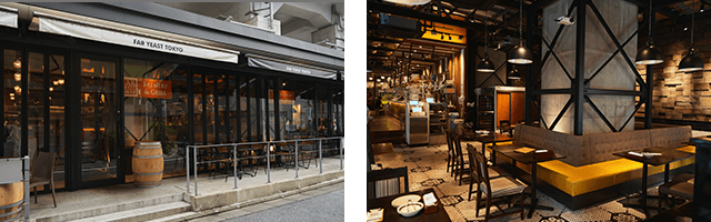 山梨発の「Far Yeast Brewing」直営のブルワリー&グリル。線路の高架下に広がる開放的な空間は、1日の締めの一杯を求めて仕事帰りのビジネスマンたちが集う。