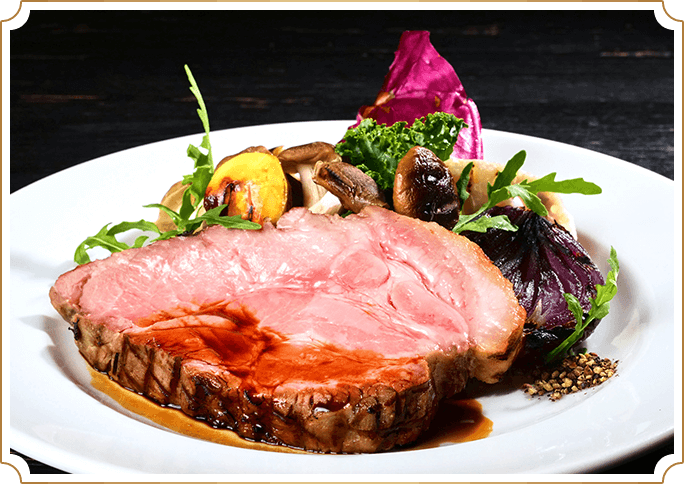 赤身と脂のバランスがいいアメリカンポークの肩ロースを、塩、黒胡椒、ローズマリー、コリアンダー、ローリエなどの香辛料で一晩マリネして、コンベンションで火入れ。しっとりジューシーに焼き上げたポークに、肉汁や赤ワインを煮詰めた甘めのビンコットソースを合わせて肉の旨みを増幅させている。さつまいもや蓮根、丹波しめじなど秋野菜と一緒に味わう、この時期だけのごちそうを召し上がれ。
