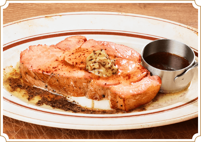 絶妙な焼き加減で仕上げるステーキが名物の同店。「アメリカンローストポーク トリュフバターソース」は、まさにステーキを思わせる肉々しさとリッチな風味を楽しめるひと皿。