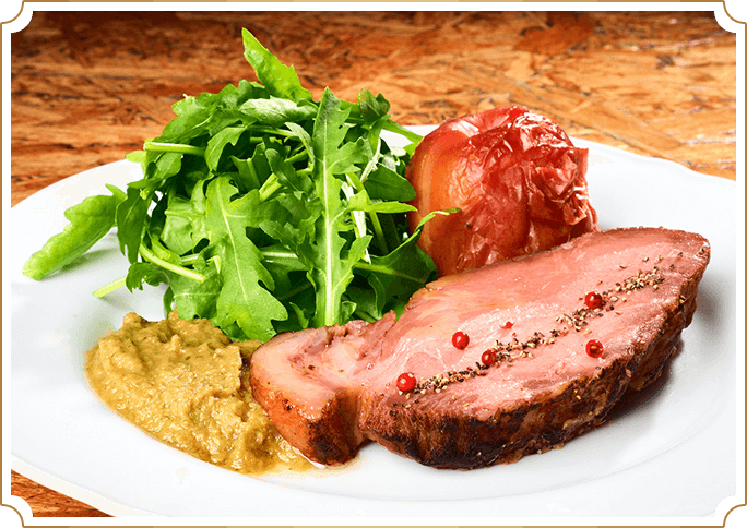 アメリカンポークに玉ねぎとリンゴの風味をまとわせながら、シンプルに160℃のオーブンで30~40分ほどロースト。付け合わせの玉ねぎのピューレ、リンゴと一緒に味わえばまた異なる表情に変わり、ローストポークを色々なパターンで楽しめるのも魅力。