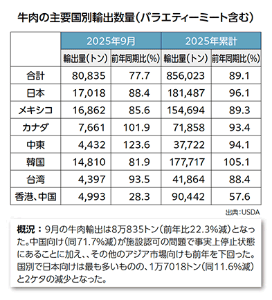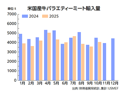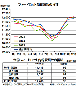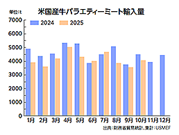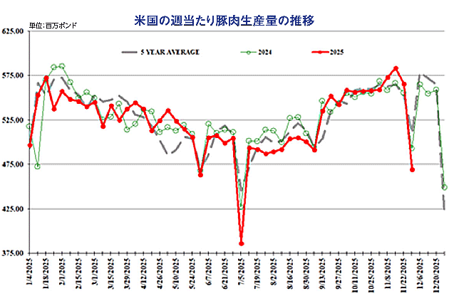 11月最終週の豚肉生産量は4億7000万ポンド(前年同週比4.7%減)で、週間のと畜頭数としては7月上旬以来の低水準となった。減少は予想されていたものの、その減少幅は事前の予測以上だった。11月第1〜3週の豚肉生産量は週平均5億7400万ポンドで、前年比2.5%増加しており、生産者は年末年始の休業を前に、11月前半の3週間で出荷を加速したようだ。