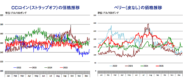 バラとトリムについては、低価格な食肉を活用したいとの外食事業者のニーズに牽引され、全体的な需要は堅調だ。通常、QSR(ファーストフード)の需要は年明けに鈍化する。しかし春季には供給の増加が限定的であることと、季節的な需要および競合する食肉の高価格を考慮すると、価格は上昇する可能性が高いだろう。
