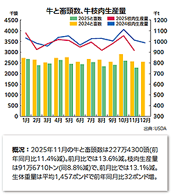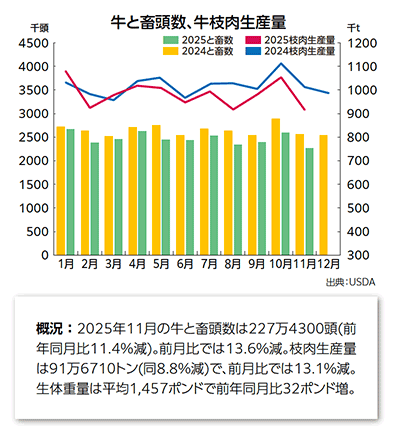 牛肉供給のひっ迫は2026年も続き、牛肉生産量は5%減と予測されている。過去最高値を更新している価格はさらに上昇する見込みだ。一方で、酪農業界での牛肉生産が増加している。高品質な牛肉生産に最適化された遺伝子を持つ酪農用子牛によって、高品質の牛肉を提供できるようになっている。