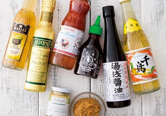 調味料は、簡単に味のバリエーションを増やすことができる強い味方。味噌、しょうゆなど和のもの、バター、オリーブ油、白ワインビネガーなど洋のものと、気分で変えてみては。また、梅干し、わさび、アンチョビなども、味付けに華やかさを演出してくれます。冷蔵庫で保存が利くものも多いので、常備しておくと良いでしょう。