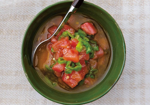- 1.トマトは皮を湯むきして、種を取り除き、1cm角に切る。 ししとうは、さっと湯通しし、3mm幅の輪切りにする。