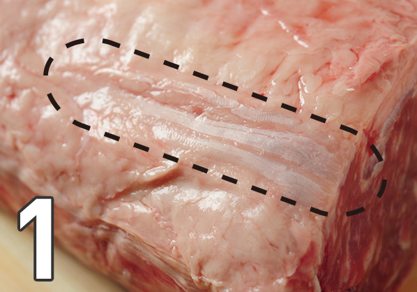 白く光ったスジの部分や脂肪を、専用のブッチャーナイフ(なければ普通の包丁でもOK)を使って取り除く。
