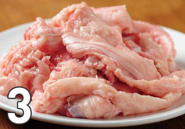 スジと余分な脂を取り除くと結構な量に。これらはそのまま煮込みにしたり、炒め物に使えるので捨てない。