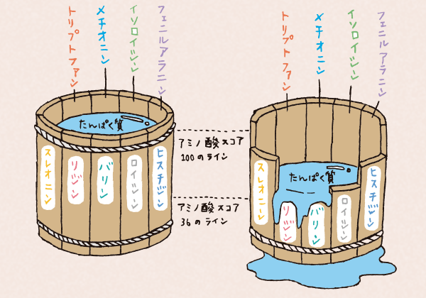 一日に必要な必須アミノ酸は、基本的には体重1kgあたり1gのたんぱく質の摂取で補えます。しかし、重要なのは量よりも質。「アミノ酸スコア」は食品ごとに必須アミノ酸の含有比率を表すもので、値が100に近いほど9種類の必須アミノ酸のバランスが良く、質が高いことを示します。下の桶の図のようにスコアが低い要素があると、その低いスコアに合わせた量のたんぱく質しか生成できません。