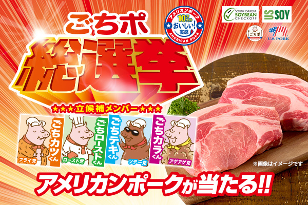 候補者は、ごちカラくん、ごちテキくん、ごちカツくん、ごちローストくんの4豚。この中から一番人気があるキャラをみんなの投票で決定!!そしてこのピッグイベントを記念してアメリカンポークなど合計330名様(各SNS合計110名様)にプレゼント!