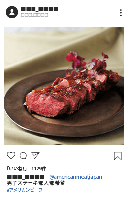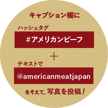 - ハッシュタグ「#アメリカンビーフ」を付け、コメント欄に @americanmeatjapan をそえて、“アメリカン・ビーフのある食卓” の写真をインスタグラムに投稿してください。