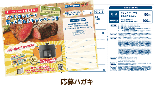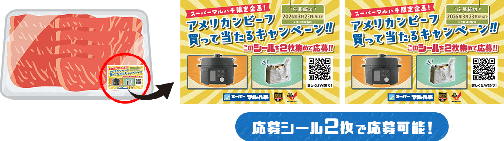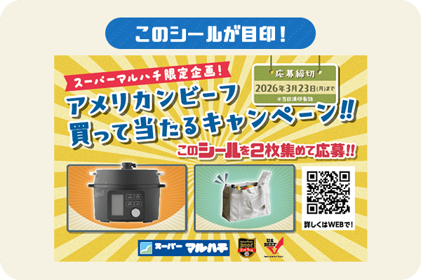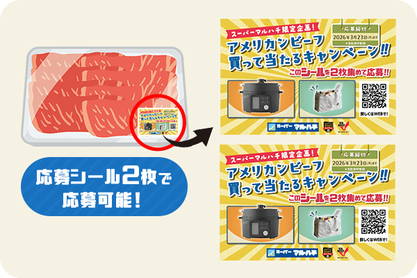 スーパーマルハチにて販売の応募シールが貼付されているアメリカンビーフ(米国産牛肉)商品を購入