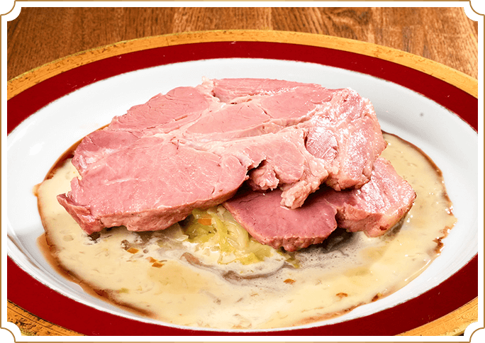 豚肉料理を得意とする町筋シェフの手腕が光るひと皿が、アメリカンポークを使った「シャルキュトリの技術でローストした肩ロース」。ポークはかたまりのまま塩漬け、乾燥、熟成を施してから120分じっくりと火を通す。塩漬けのひと工程をかけることで、しっとりしたアメリカンポークにハムのような旨みが加わり深みのある味わいに。ソース・ヴァン・ブラン(白ワインクリームソース)とソース・ポルト(ポルト酒ベースの甘いソース)のフレンチの王道ソースが、ワンランク上のおいしさへと昇華させる。