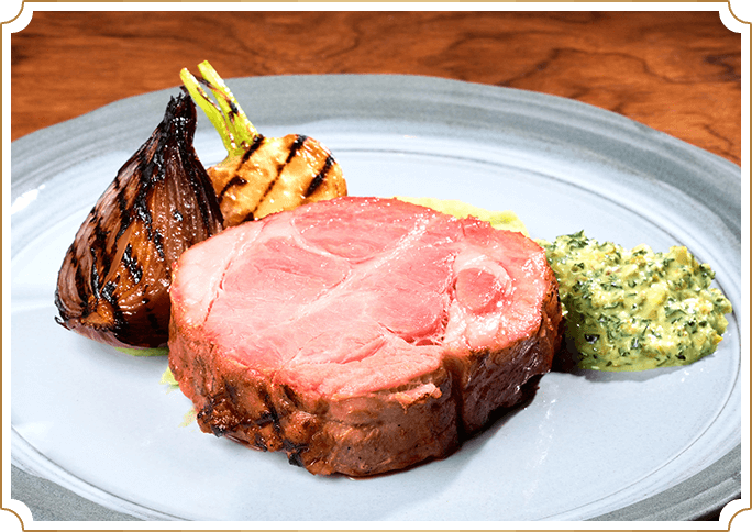 アメリカンポークに玉ねぎとリンゴの風味をまとわせながら、シンプルに160℃のオーブンで30~40分ほどロースト。付け合わせの玉ねぎのピューレ、リンゴと一緒に味わえばまた異なる表情に変わり、ローストポークを色々なパターンで楽しめるのも魅力。