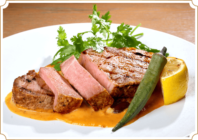 部位はサシが細かく火を通してもパサつきにくい、肩ロースをセレクト。ケイジャンスパイスでマリネしたあと低温で火入れし、香ばしさをプラスするために提供直前に表面をグリルして仕上げる。スパイシーな風味のローストポークと香味野菜をたくさん使用したバターソースの複雑な風味が絡んだあとをひく美味しさに食べる手が止まらなくなる。