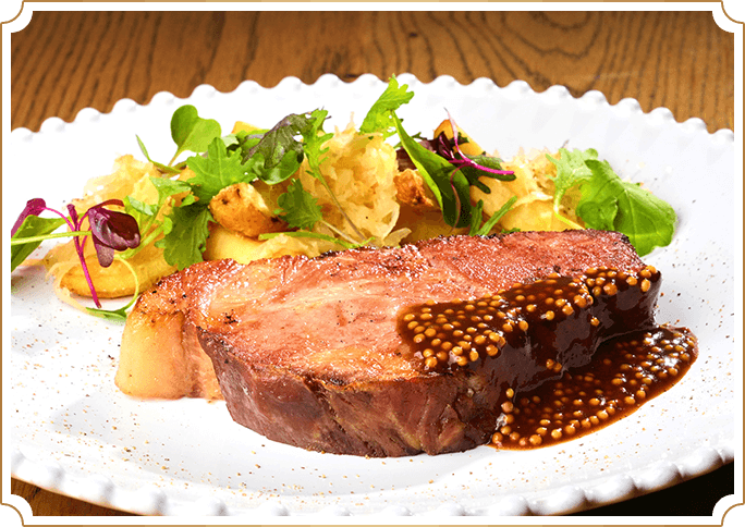 自慢は薪火を使ったグリル料理。その技術を用いた「ローストポーク」は、塩でマリネしたアメリカンポークの肩ロース塊肉を3時間かけて低温調理。仕上げに表面を薪火で焼いて仕上げる。カットすると薄ピンク色の断面が現れ、目にもおいしいローストポークに食欲が刺激される。グレイビーソースがベースの粒マスタードソースで、シンプルにポークのおいしさを堪能できるのもポイント。