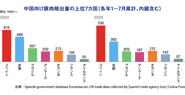 中国はEU産豚肉に反ダンピング調査に伴う関税を課しているが、スペインは中国との関係強化と豚肉市場でのシェア拡大を図ってきた。スペインはEU最大の豚肉生産国であり、生産量の約4分の1を占める。年間豚肉輸出額は約35億ユーロ(40億5000万ドル)にのぼる。