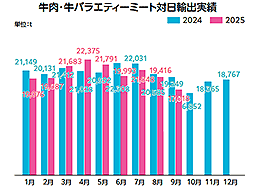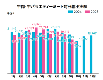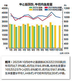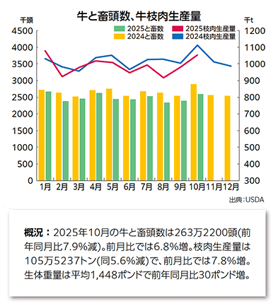 11月最終週の豚肉生産量は4億7000万ポンド(前年同週比4.7%減)で、週間のと畜頭数としては7月上旬以来の低水準となった。減少は予想されていたものの、その減少幅は事前の予測以上だった。11月第1〜3週の豚肉生産量は週平均5億7400万ポンドで、前年比2.5%増加しており、生産者は年末年始の休業を前に、11月前半の3週間で出荷を加速したようだ。